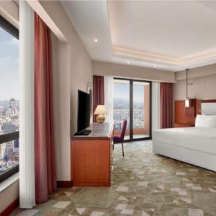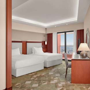 Spacious twin corner room offering a balcony with a view of Cairo City. It has a seating area and a 32-inch flat-screen TV.