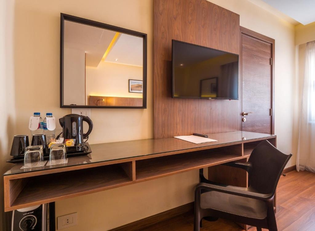 This recently refurbished to a high standard with slick and modern interior, air-conditioned room offers a small seating area with a 48″ flat screen TV, high speed WiFi, and tea, coffee and herbal infusion selection. Free toiletries are provided in the bathroom which has a walk in shower.
