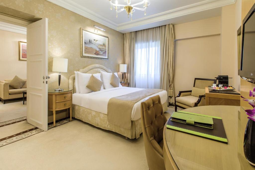 This Suite includes: – 1 Bedroom – 1 Living Room – 2 Bathrooms – 2 flat-screen TVs with satellite channels – Private Balcony with City view – Free Wi-Fi – Free access to our Executive Lounge – Free butler service – Free tea and coffee facilities – Pillow concierge – Free access to spa facilities (Sauna, hot tub and steam room) – Free toiletries – Slippers